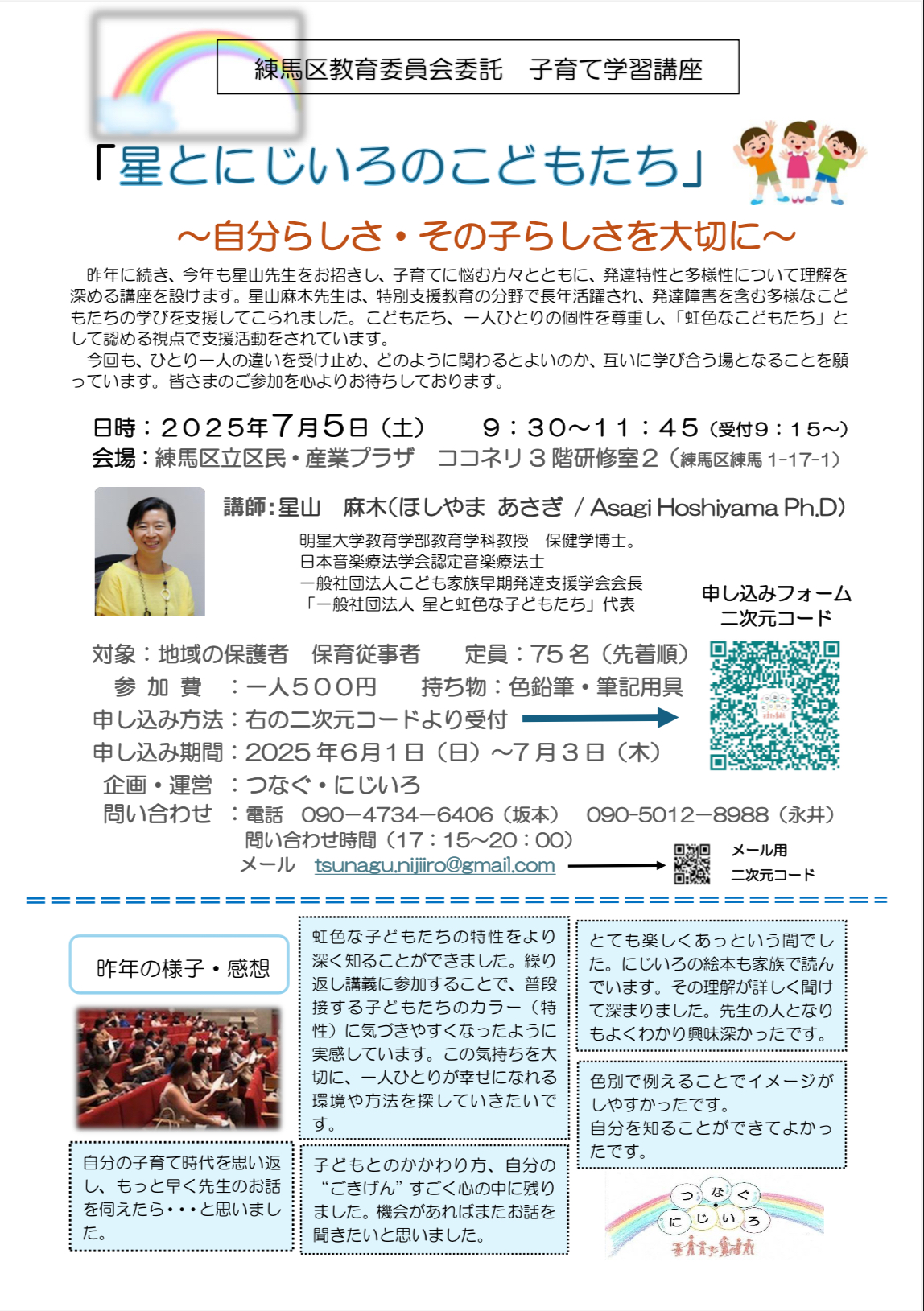 講演会のお知らせ(子育て学習講座) イベント 2025.06.08 練馬区教育委員会委託の子育て学習講座のお知らせです。 「星とにじいろのこどもたち」 〜自分らしさ・その子らしさを大切に〜 講師:星山麻木
